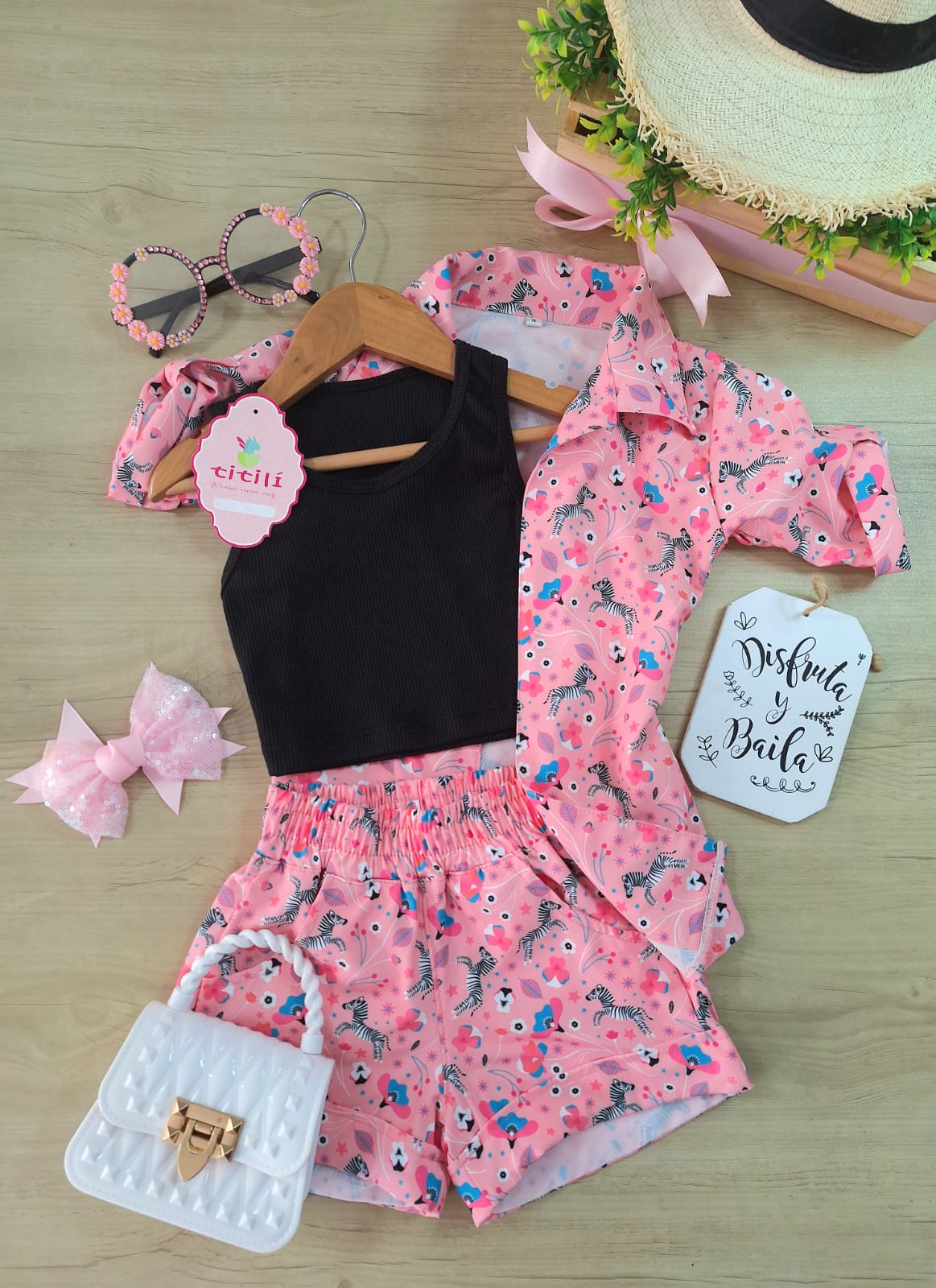 Set de tres piezas: short, gabán y crop top.