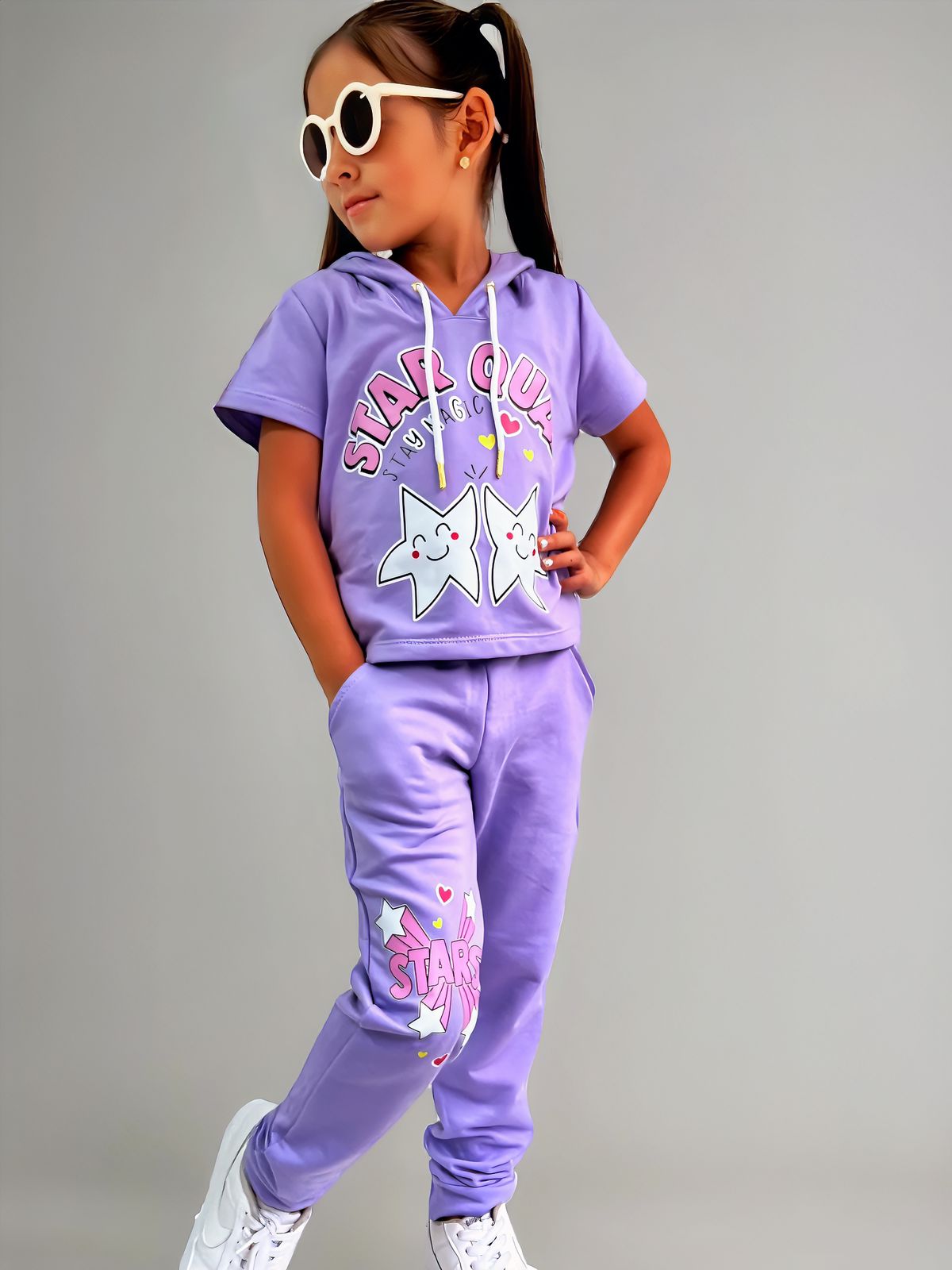 Conjunto deportivo elaborado en burda licrada; sudadera con bolsillos funcionales y estampado lateral; chompa de manga corta con estampado y detalle de cordón ajustable.
