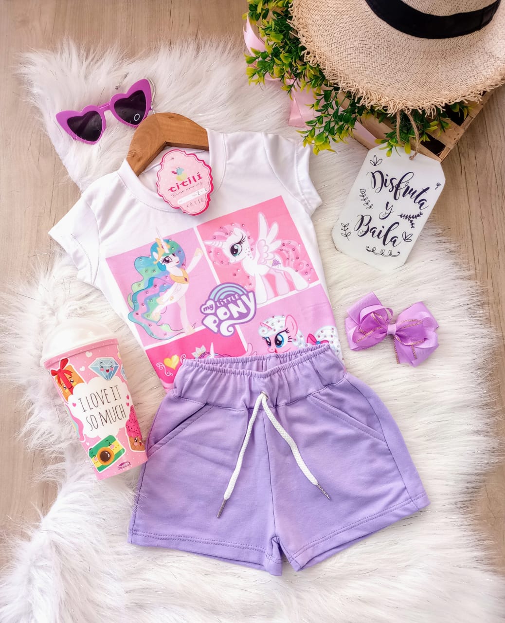 Short elaborado en burda licrada de la mejor calidad y bolsillos funcionales. Blusa en piel durazno decorada con pedrería.