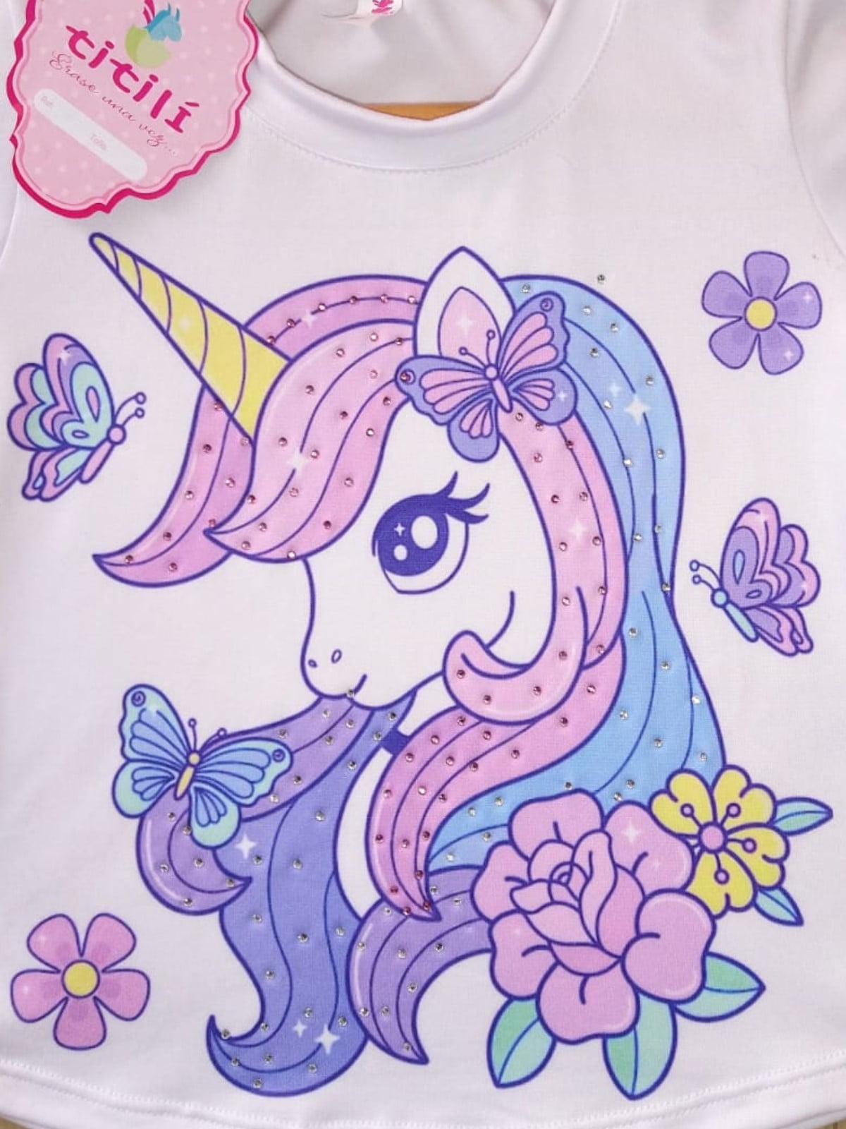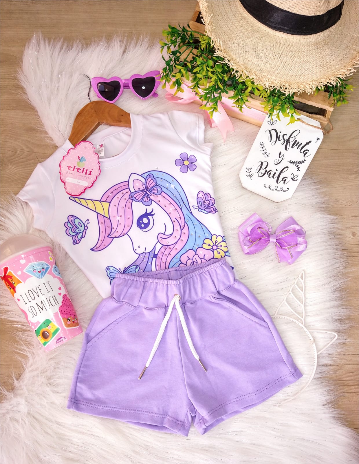 Short elaborado en burda licrada de la mejor calidad y bolsillos funcionales. Blusa en piel durazno decorada con pedrería.