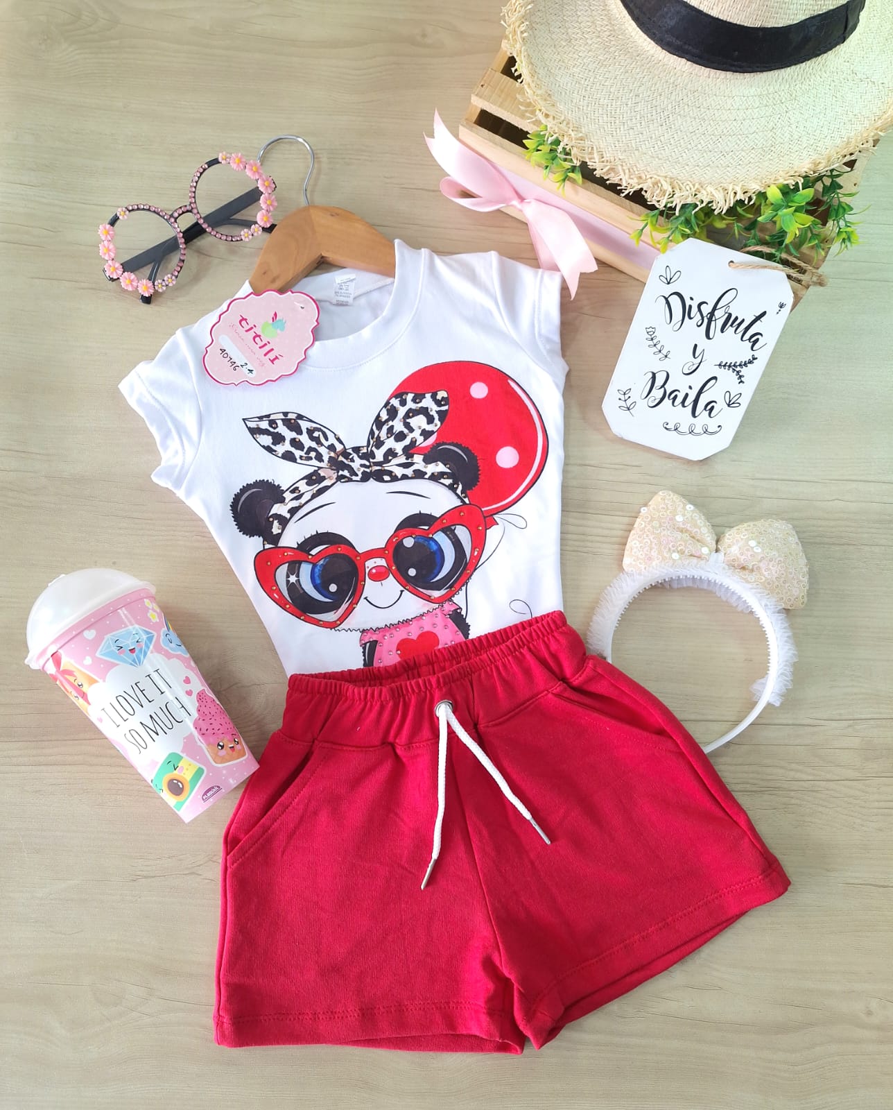Short elaborado en burda licrada de la mejor calidad y bolsillos funcionales. Blusa en piel durazno decorada con pedrería.
