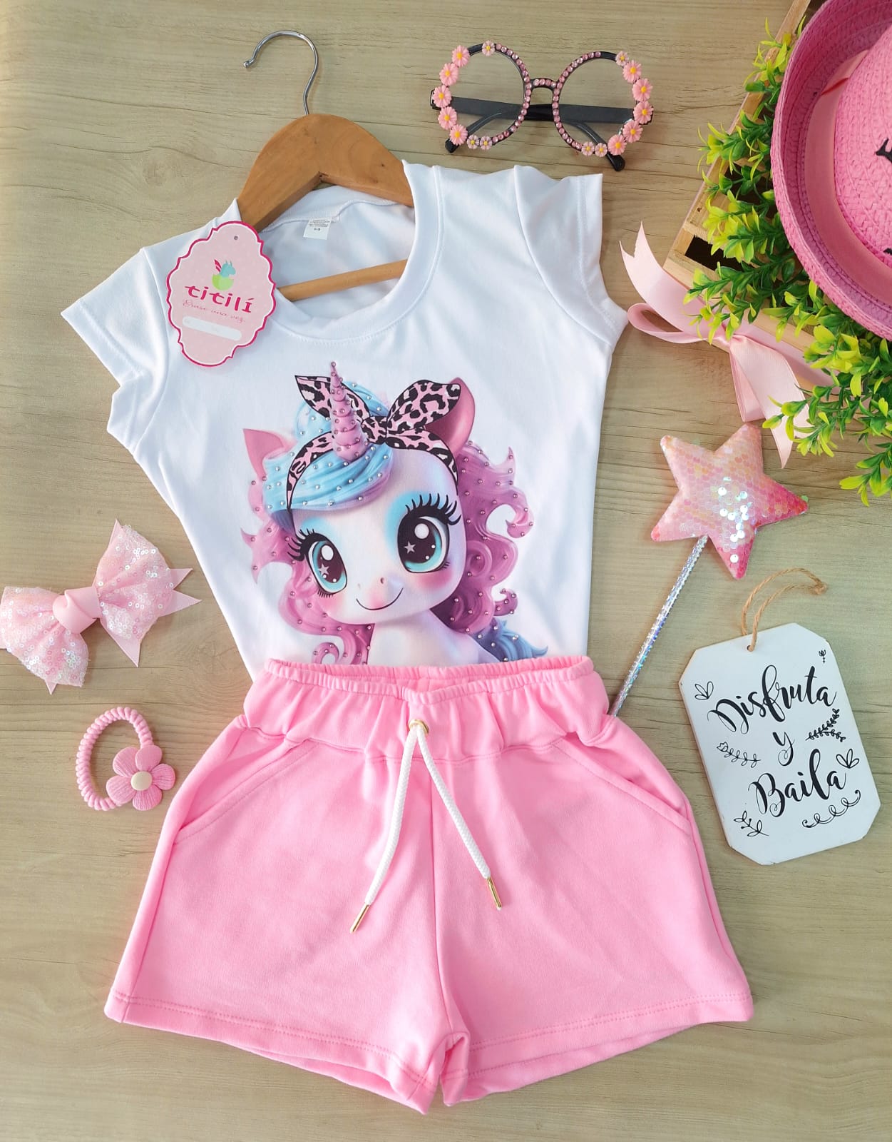 Short elaborado en burda licrada de la mejor calidad y bolsillos funcionales. Blusa en piel durazno decorada con pedrería.