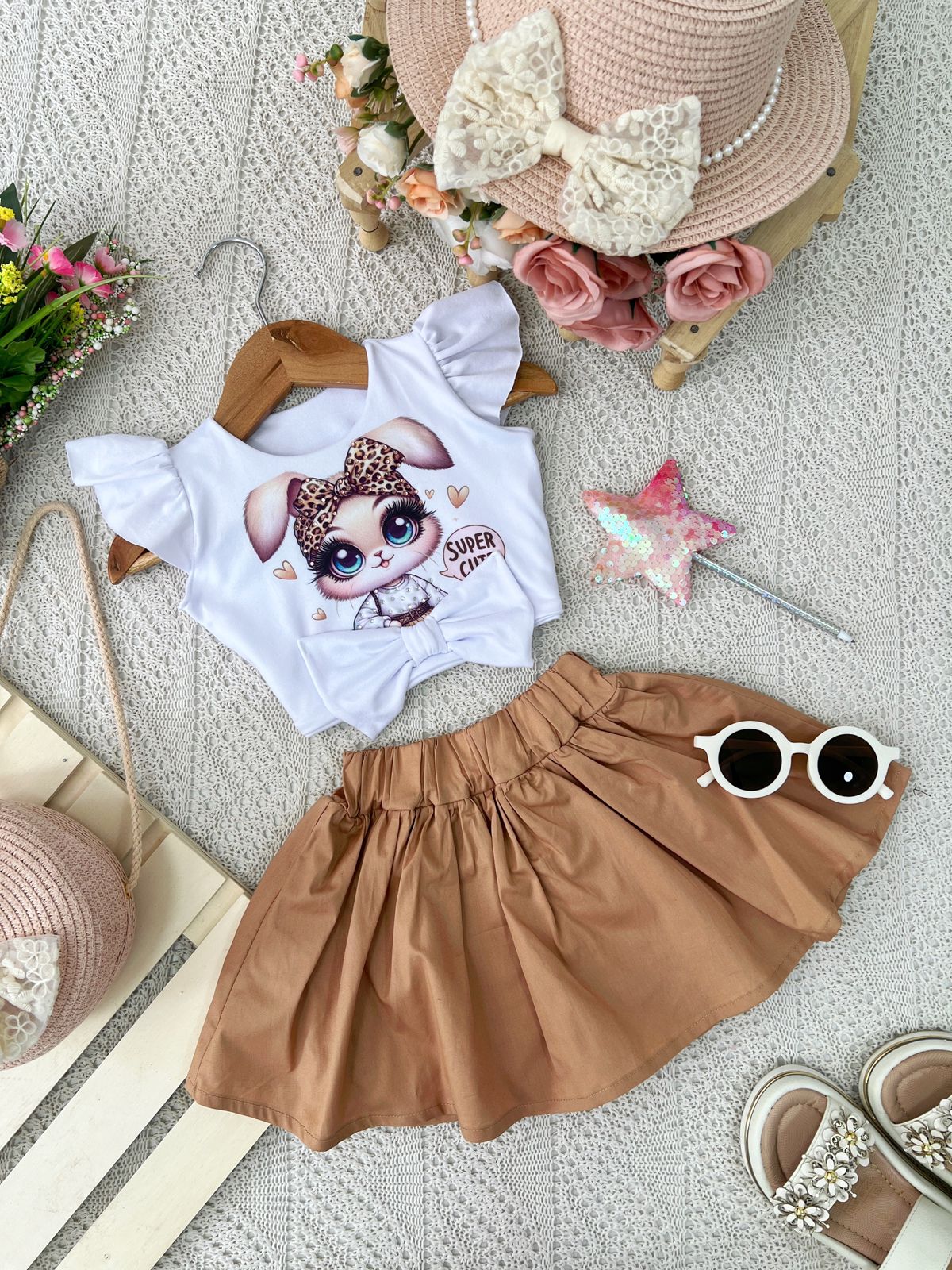 Hermoso conjunto de crop top elaborado en piel de durazno forrado en doble tela para mayor calidad, estampados exclusivos de la marca decorados con pedrería; y falda en popelina con short interno.