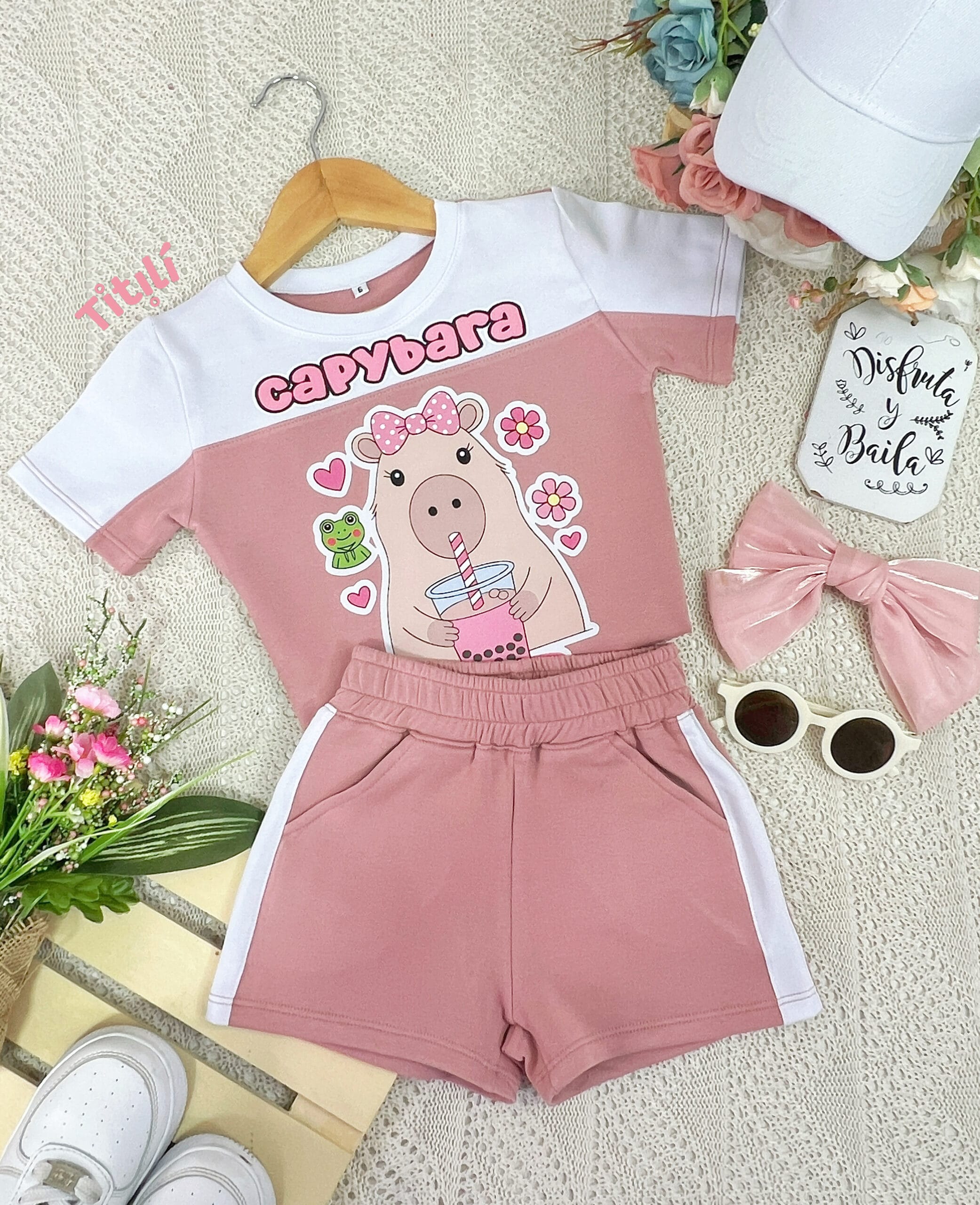 Conjunto de short y blusa elaborado en Burda licrada, con bolsillos funcionales, combinado blanco y elástico en la cintura para un mejor ajuste