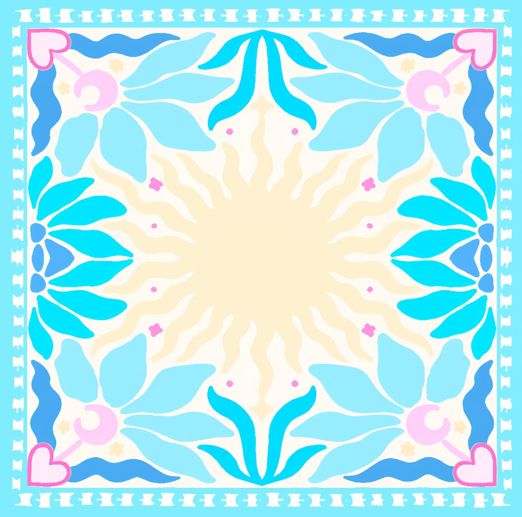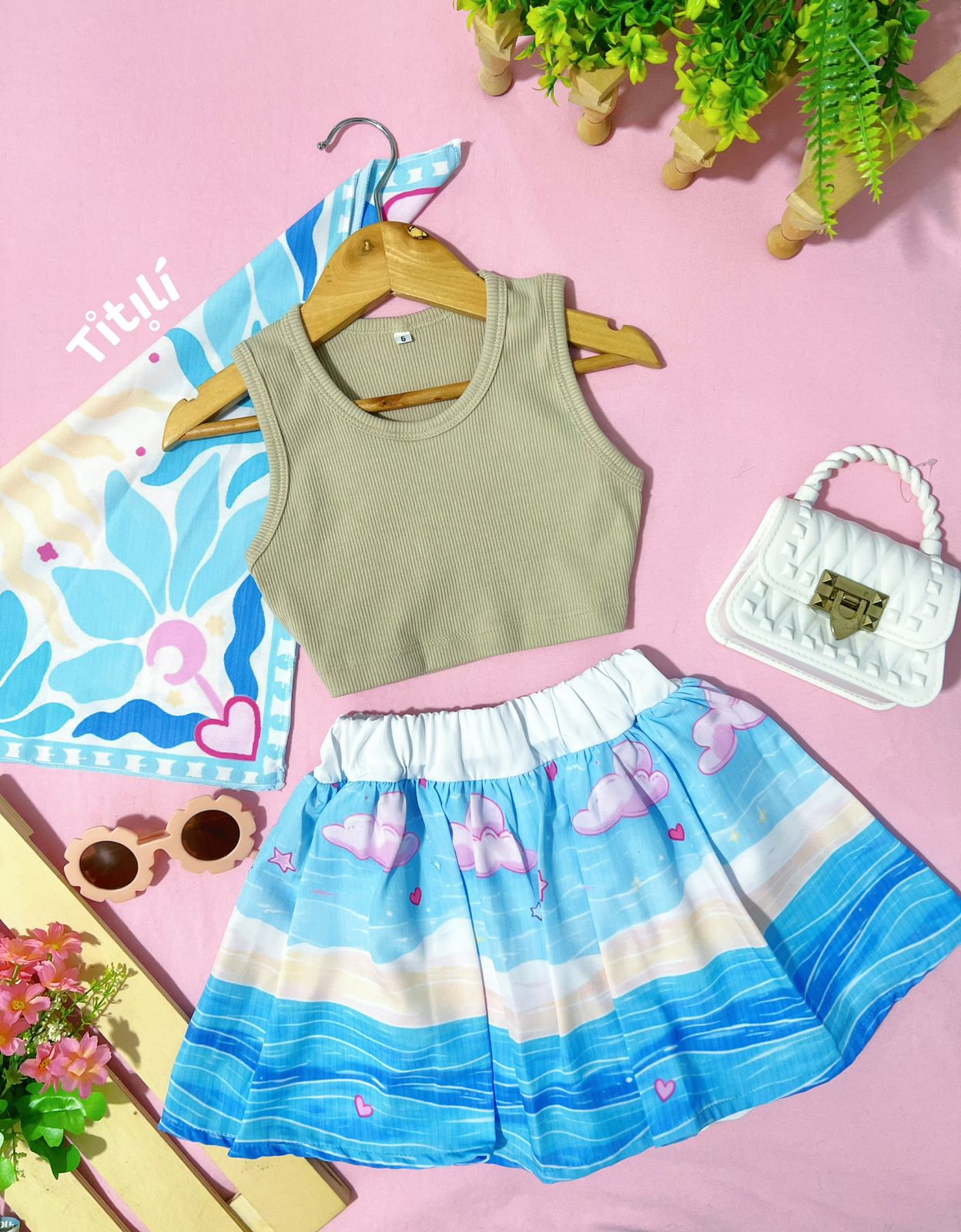 Falda con short interno y pañoleta elaborada en una base de seda que no encoge ni arruga, con sublimados exclusivos localizados; crop top elaborado en Rib.