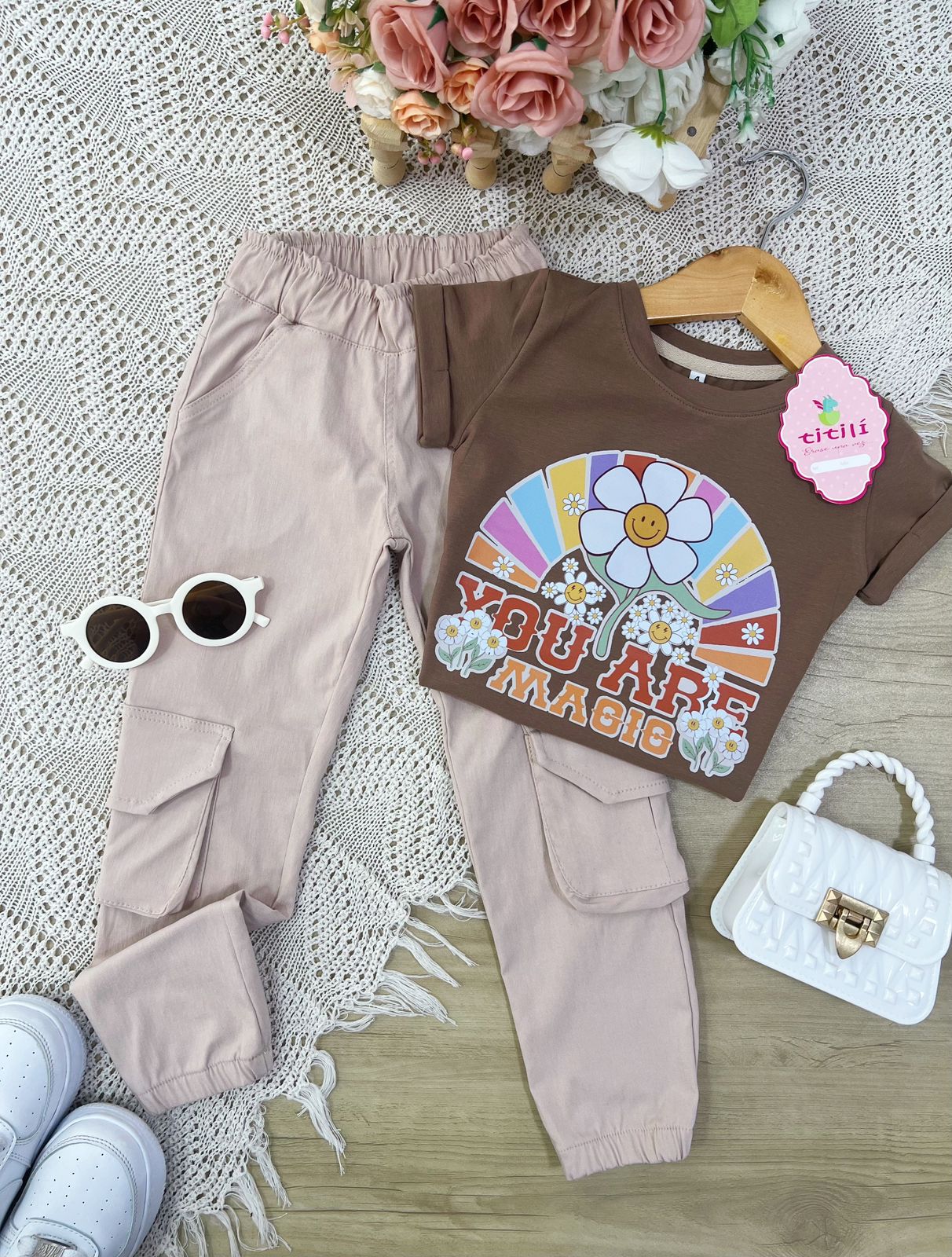 Pantalón cargo con bolsillos funcionales, elaborado en bengalina licrada y con elástico en la cintura y tobillos para un mejor ajuste. Camiseta en tela fría con estampados exclusivos de la marca.