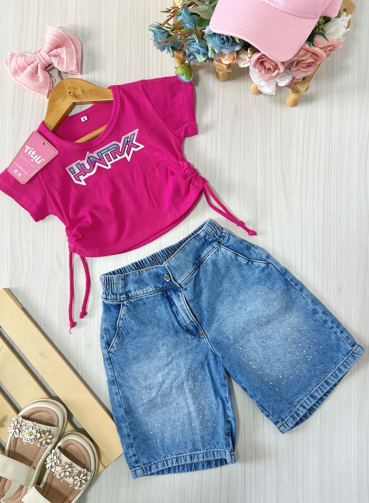 short elaborado en denim liviano con silueta amplia, con elástico posterior para un mejor ajuste, cierre, bolsillos funcionales y decorado con pedrería.